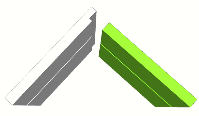 我们提到过采用上图所示的方式,可以在阴角对U型槽的石材阴角收口起到很好的作用。但是,如果用同样的方法处理V字缝在阴角的收口时,就会出现问题,就像下面这样。