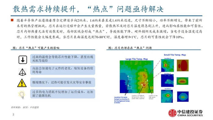 芯片“热点”问题亟待解决。随着半导体产业遵循着摩尔定律逐步向2纳米、1纳米甚至是埃米级别迈进,尺寸不断缩小,功率不断增大,带来了前所未有的热管理挑战。芯片在运行过程中会产生大量热量,若散热不及时芯片温度将急剧上升,进而影响其性能和可靠性。芯片内部热量无法有效散发时,局部区域会形成“热点”,导致性能下降、硬件损坏及成本激增。