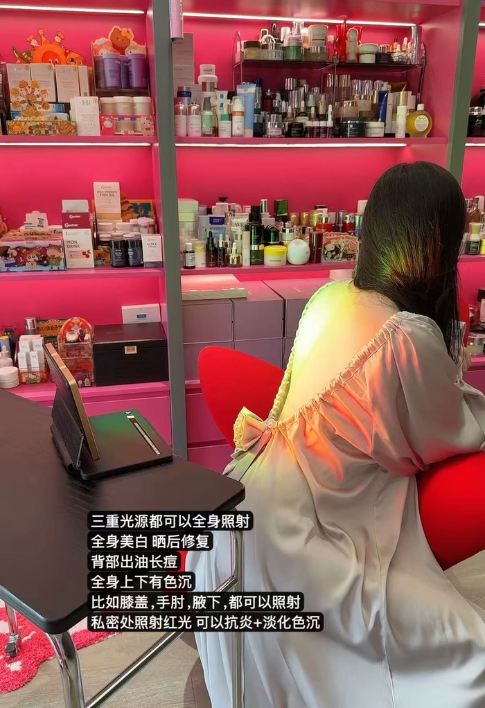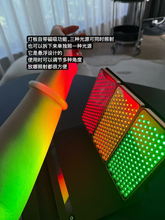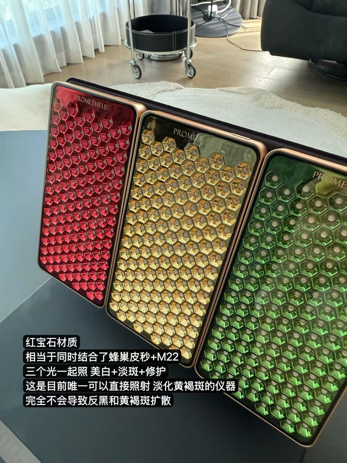 这一台仪器,相当于家用M22+皮秒,可以同时美白+淡斑,剔除了常见大排灯使用的易反黑蓝光,采用了成本更昂贵的红宝石材质,匹配三色光源,同时照射美白去黄效果更好的红光和淡斑的黄光,以及修复敏感的绿光!