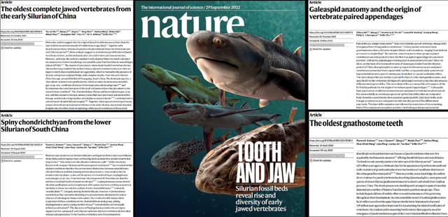 但是 , 为什么说人是从鱼演化而来的呢 ? 在 2022 年的时候 , 朱敏老师带着我们整个早期脊椎动物研究课题组 , 在 Nature一期发表了四篇文章 , 讲的就是我们发现了最早的有颌类祖先 , 为我们探索从鱼到人的演化提供了最为关键的环节 。